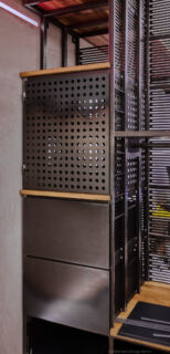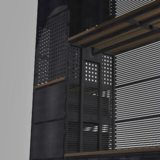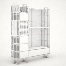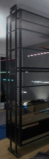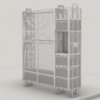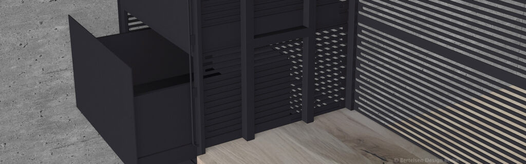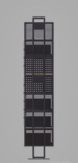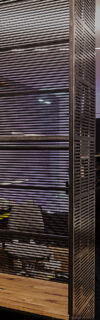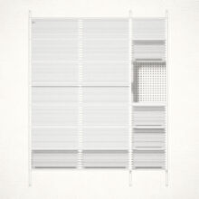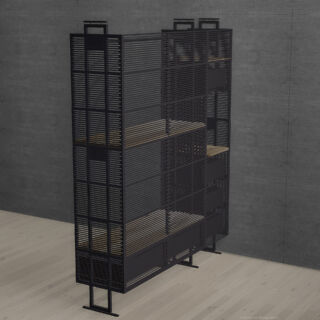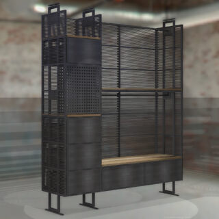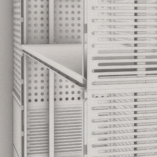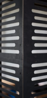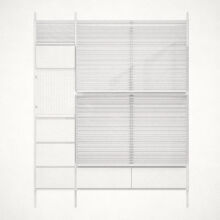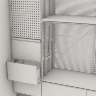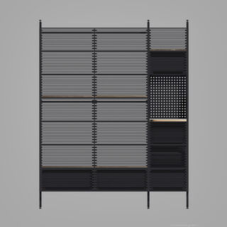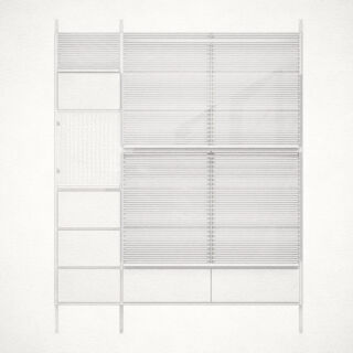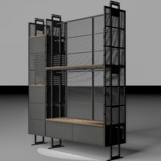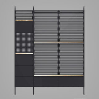Ein mit Lochblechen gestaltetes Segment bildet einen ästhetischen Kontrapunkt zu den dominierenden horizontalen Schlitzen.Dieser Entwurf verdankt sich einem speziellen Auftrag. Das Möbel enthält verschiedene Elemente, die andersartig entworfen und zusammengebaut werden können, um Wünschen und räumlichen Gegebenheiten entgegenzukommen.