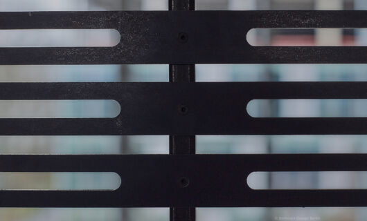 Um nicht das Gefühl von Enge zu erzeugen und für das quer zum Raumteiler einfallende Tageslicht möglichst durchlässig zu bleiben, verwendete ich geschlitzte Bleche.