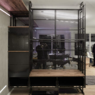 Auf der Wohnzimmerseite befindet sich direkt neben dem Eingang ein offenes Segment mit Ablagefläche und Haken für die Schlüssel. Außerdem ist dort die Gegensprechanlage installiert. An den geschlitzten Blechen sind Haken für Jacken, Regenschirme o. Ä. angebracht.