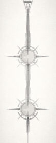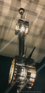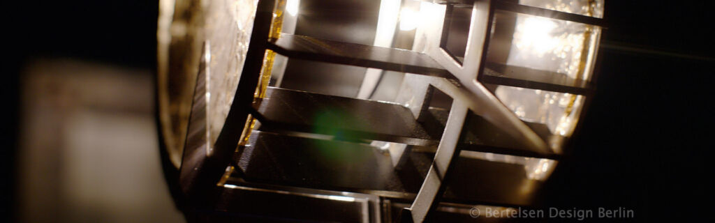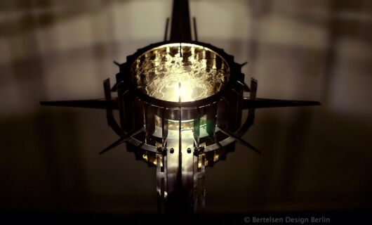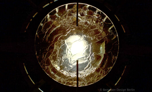 Ich wählte hierfür ein postapokalyptisches Sujet mit antik anmutendem Glas, eingefasst von Metallrippen und –stacheln, die eine Reihe weicher Lichtmuster entlang der Wände erzeugen und damit dem Eingangsbereich etwas Abenteuerliches verleihen.