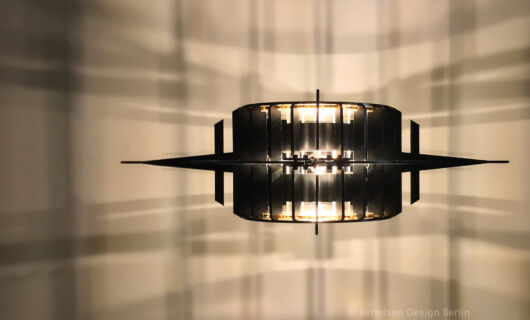 Die Herausforderung beim Entwurf dieser Leuchte bestand darin, in einem kleinen, annähernd quadratischen Flur mit fast vier Meter hoher Decke für eine Grundbeleuchtung zu sorgen und den oben ungenutzten Raum mit einem vom Eisen geformten Licht-Schatten-Spiel zu schmücken.