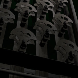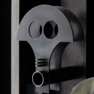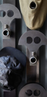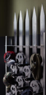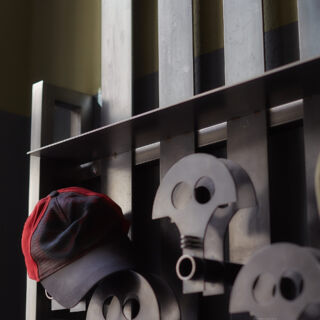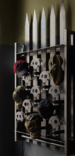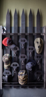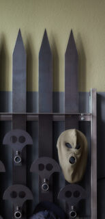 13 doppellagige „Gesichter“ in Form stilisierter Schädel, befestigt auf einem Wandregal, das an das schaurige Mittelalter erinnert. Zur Ablage für Masken und Hüte.