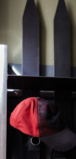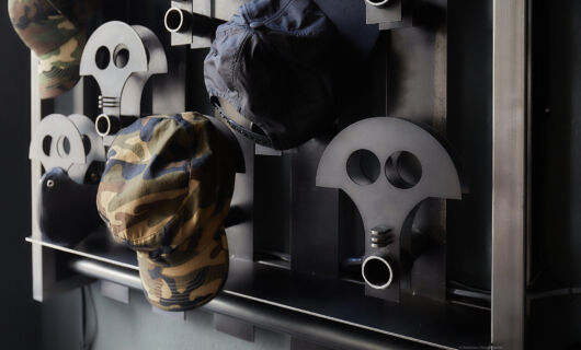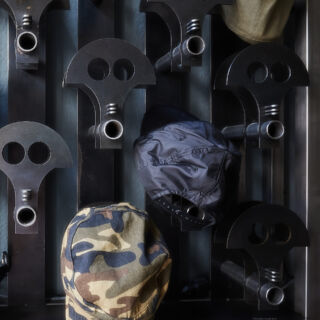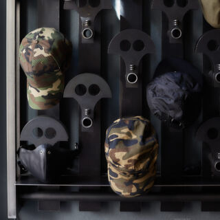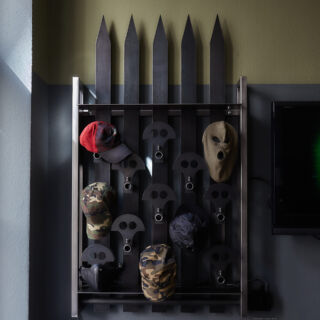 Das Maskenregal bietet unseren Kopfbedeckungen einen Platz, an dem sie sich sehen lassen können, selbst wenn sie nicht im Einsatz sind.