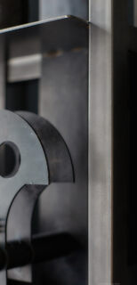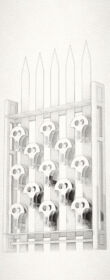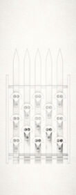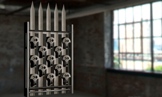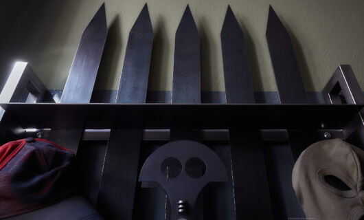 Mit einem stilisierten Schädelelement schuf ich hierfür eine Reihe von Gesichtern, die aus dem Möbel starren und förmlich darum betteln, einen Hut oder eine Maske tragen zu dürfen. Um das „gotische“ Thema noch weiterzutreiben, bediente ich mich einer Reihe von Eisenstreben mit Spitzen als Rückwand, als Anspielung auf die mittelalterlichen Fallgittertore alter Burgen.