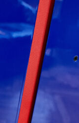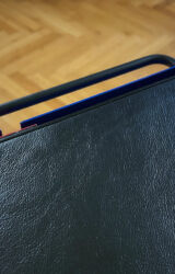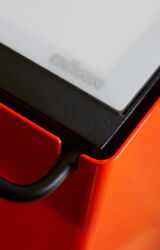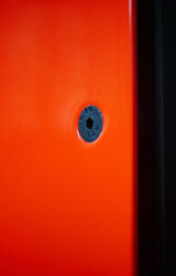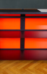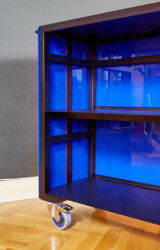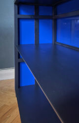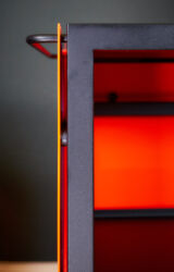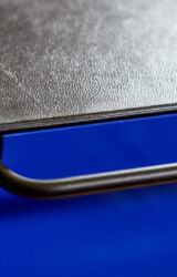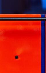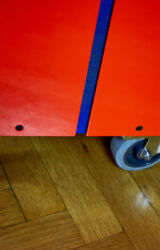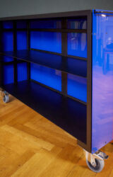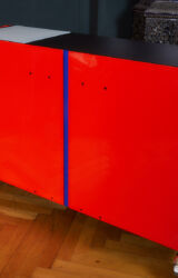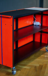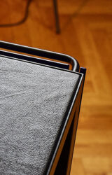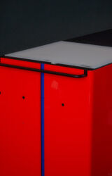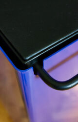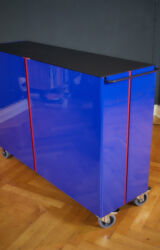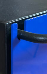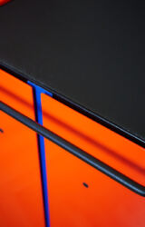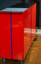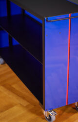 Der Rollcontainer ist hauptsächlich aus pulverbeschichteten Vierkantstahlrohren und lasergeschnittenen hochglanzlackierten (Autolackierung) Eisenblechen gemacht. Die Farben sind hier dunkelgrau/schwartz, rot und blau. Es stehen auch andere Farben zur Auswahl. Oberplatte: Mit schwarzem Leder bezogen.