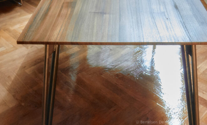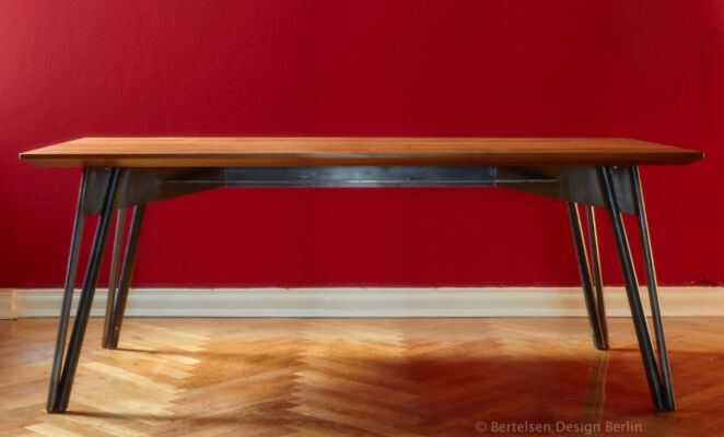 Die Tischplatte wurde von Hand aus Teakholzstäben angefertigt und geölt. Sie kann geschliffen und nachgeölt werden, um Gebrauchsspuren zu entfernen, falls die Party doch einmal zu wild wird.